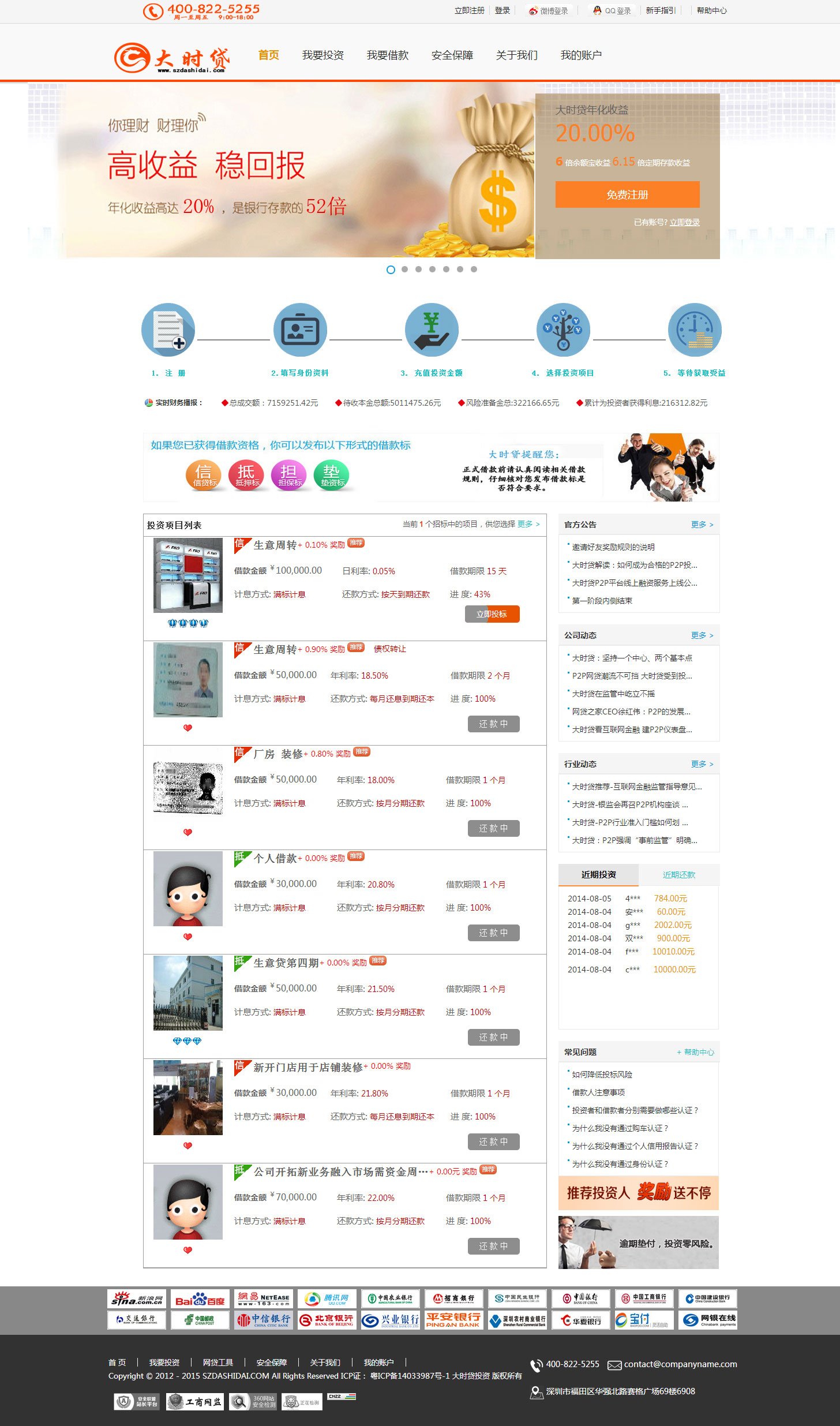 案例描述:大時貸是中國最有實力的網(wǎng)貸平臺,P2P網(wǎng)貸,P2P網(wǎng)絡借貸平臺,最可靠的民間P2P網(wǎng)上借貸平臺。為投資、理財人士提供安全、高收益的投資理財產(chǎn)品,為中小企業(yè)提供無抵押信用貸款、房產(chǎn)抵押貸款等服務。