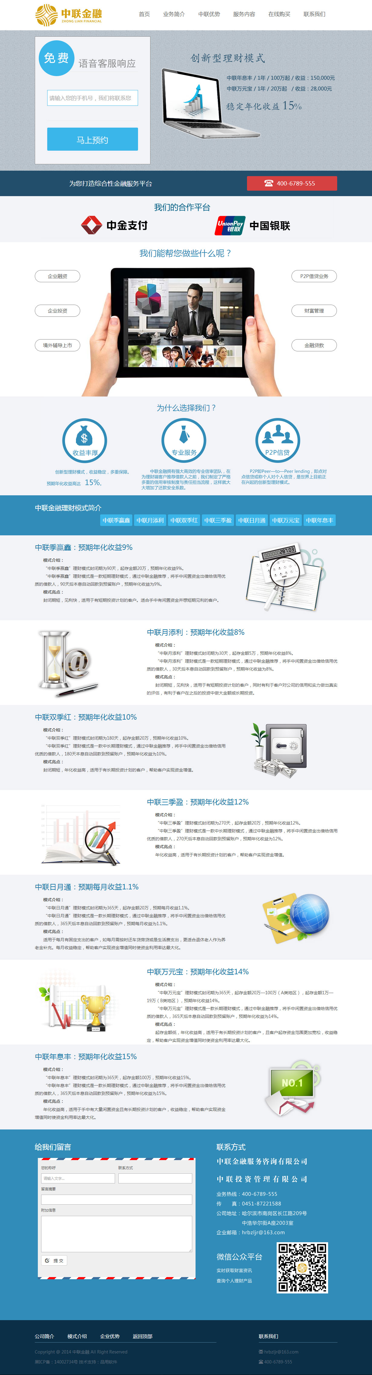 案例描述:中聯(lián)金融服務(wù)咨詢有限公司、中聯(lián)投資管理有限公司為中聯(lián)集團(tuán)旗下子公司,是經(jīng)國家批準(zhǔn)規(guī)定許可經(jīng)營的金融投資公司,是中國互聯(lián)網(wǎng)金融協(xié)會(huì)會(huì)員單位,是專業(yè)從事小額貸款、行業(yè)投資、信用風(fēng)險(xiǎn)評(píng)估、信用數(shù)據(jù)整合服務(wù)、融資咨詢及個(gè)人理財(cái)?shù)慕鹑诜?wù)機(jī)構(gòu);為有短期資金需求的個(gè)人、中小企業(yè)資金周轉(zhuǎn),項(xiàng)目引進(jìn),產(chǎn)品開發(fā)等進(jìn)行資金出借、投資擔(dān)保,為有理財(cái)需求的個(gè)人進(jìn)行出借服務(wù)咨詢。