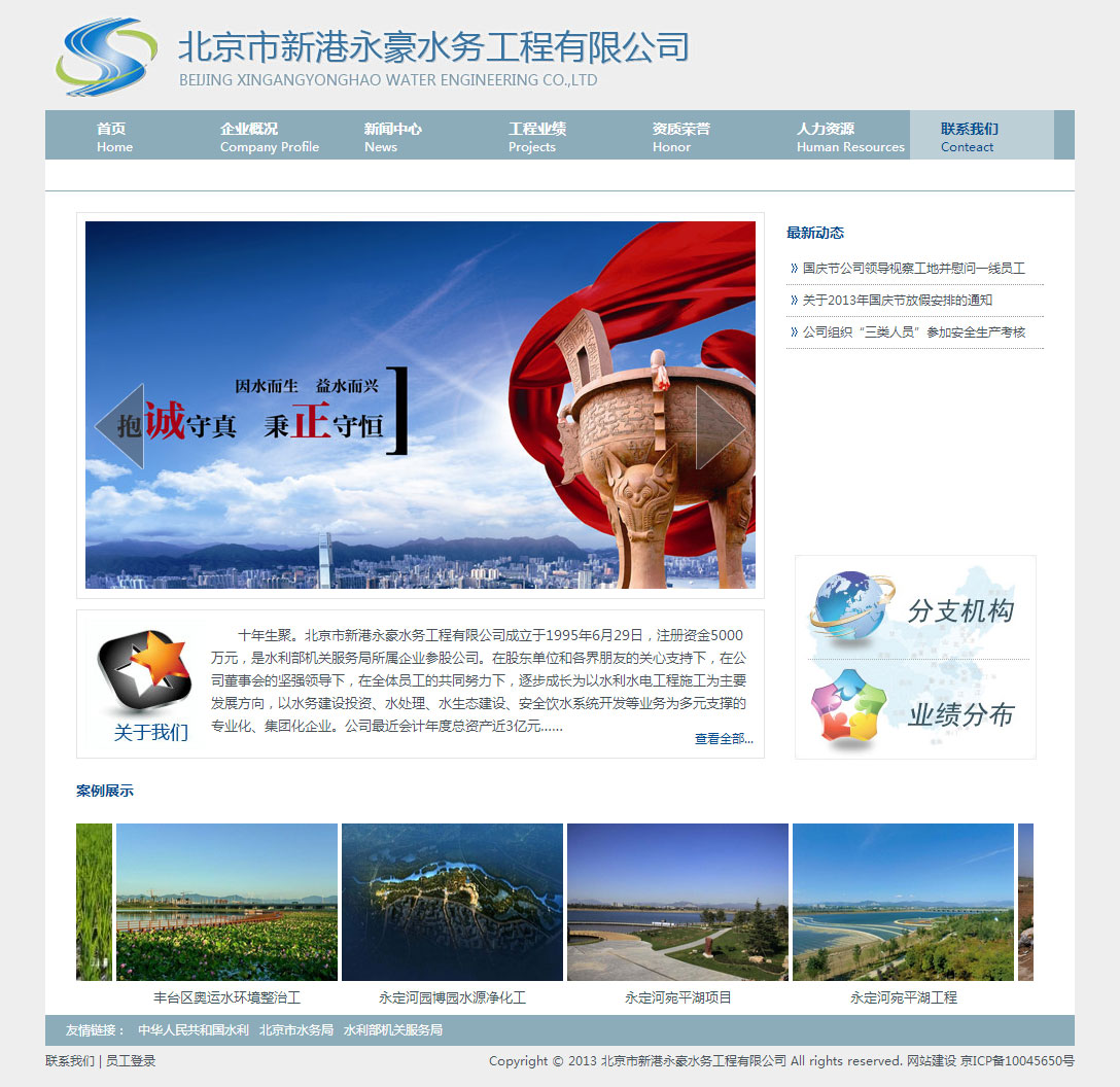 客戶簡介:十年生聚。北京市新港永豪水務工程有限公司成立于1995年6月29日,注冊資金5000萬元,是水利部機關服務局所屬企業(yè)參股公司。在股東單位和各界朋友的關心支持下,在公司董事會的堅強領導下,在全體員工的共同努力下,逐步成長為以水利水電工程施工為主要發(fā)展方向,以水務建設投資、水處理、水生態(tài)建設、安全飲水系統(tǒng)開發(fā)等業(yè)務為多元支撐的專業(yè)化、集團化企業(yè)。公司最近會計年度總資產(chǎn)近3億元。至2012年底,連續(xù)8年業(yè)務總額持續(xù)增長,近3年主營業(yè)務收入增幅更超過30%以上,3次榮獲全國水利優(yōu)秀企業(yè)稱號。