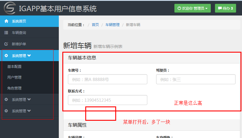 所遇到的問題就出現(xiàn)了,當點擊左側(cè)的下拉菜單時,會導致右側(cè)的第一欄車輛基本信息內(nèi)的高度增加,很詭異的跟著左側(cè)下拉菜單的動畫效果,也增長了!效果圖: