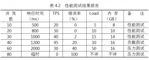 測試結(jié)果報告應能夠反映上述性能測試曲線的規(guī)律,閱讀者可以得到系統(tǒng)性能是否滿足設(shè)計目標和業(yè)務要求、系統(tǒng)最大負載能力、系統(tǒng)最大壓力承受能力等重要信息,表4.2是一個簡單示例。