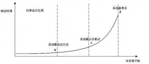 在日常運行區(qū)間,可以獲得最好的用戶響應時間,隨著并發(fā)用戶數(shù)的增加,響應延遲越來越大,直到系統(tǒng)崩潰,用戶失去響應。