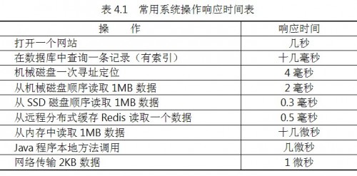 指應用執(zhí)行一個操作需要的時間,包括從發(fā)出請求開始到收到最后響應數(shù)據(jù)所需要的時間。響應時間是系統(tǒng)最重要的性能指標,直觀地反映了系統(tǒng)的“快慢”。表4.1列出了一些常用的系統(tǒng)操作需要的響應時間。