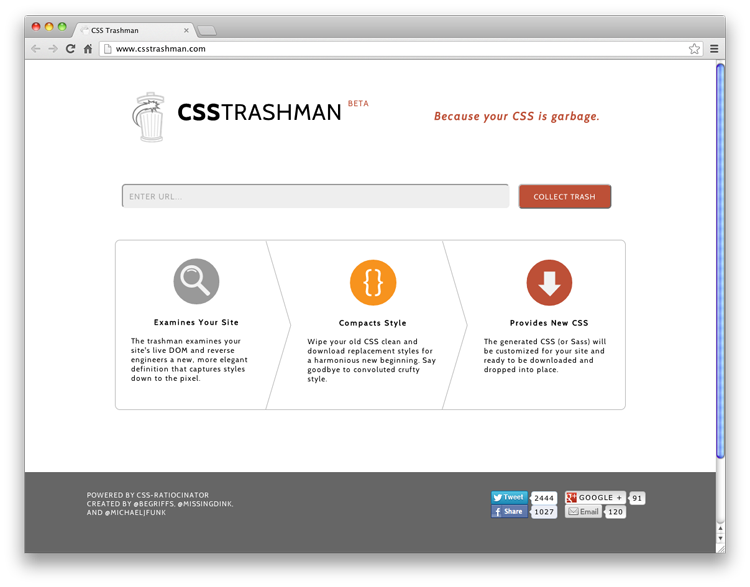 在大的項(xiàng)目中,保持 CSS 文件的簡(jiǎn)潔和緊湊是非常空難的。不過(guò)不要擔(dān)心,CSS Trashman 可以幫助你。這個(gè)在線工具檢查您的網(wǎng)站,壓縮樣式,讓你下載一個(gè)超級(jí)干凈的版本的網(wǎng)站 CSS 文件,這樣你就可以安全地刪除它們。更多信息: http://www.csstrashman.com/