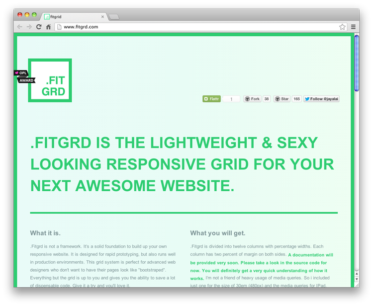 .Fitgrd 是一個(gè)輕量的響應(yīng)式網(wǎng)格系統(tǒng),是建立你自己的響應(yīng)式網(wǎng)站的堅(jiān)實(shí)的基礎(chǔ)。更多信息: http://www.fitgrd.com/