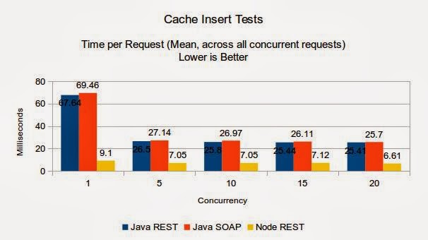 我最近做了一些簡(jiǎn)單的關(guān)于內(nèi)存的Web Service性能測(cè)試。我使用Java(REST + SOAP)和Node.js(REST)將一些接口功能緩存起來(lái)。跟期望的一樣,Node應(yīng)用的性能遠(yuǎn)遠(yuǎn)超出Java。(響應(yīng)時(shí)間至少快1倍以上)。