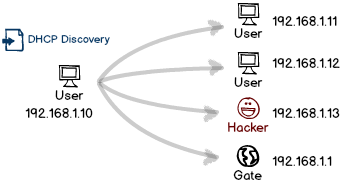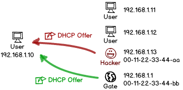 尚若黑客也在內(nèi)網(wǎng)里也開啟了 DHCP 服務(wù),用戶收到的回復包很可能就是黑客發(fā)出的,這時用戶的網(wǎng)絡(luò)配置完全聽天由命了,不想被劫持都難了。