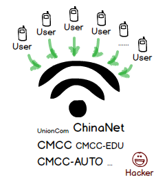 不用說,你也想到開熱點釣魚了。并且用戶幾乎都是用 WiFi 來連接,也就沒有必要使用 WLAN 設(shè)備。使用之前的大功率熱點,取個 CMCC 的名字,放在陽臺上對著大街,不一會就連上一堆用戶了。要是支持虛 AP 的話,把 CMCC-AUTO,ChinaNet 等等這些名字全部用上,前來光臨的就更多了。