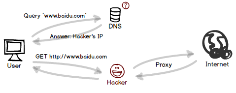 如果有人冒充回復,并搶在正常人之前,偽造的答案也就先入為主。IP 被解析到錯誤的地址上,之后所有的通信都被劫持了。