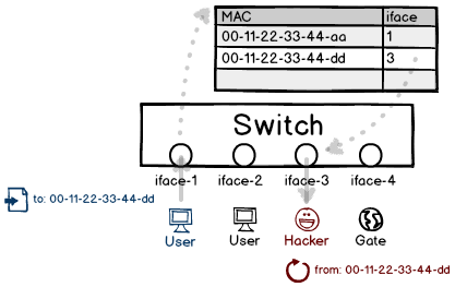 然而這種學習并不智能,甚至太過死板,任何一個道聽途說都會當作真理。用戶發(fā)送一個自定義源 MAC 地址的包是非常容易的,因此交換機成了非常容易被忽悠的對象。只要偽造一個源地址,就能將這個地址關(guān)聯(lián)到自己的接口上,以此獲得受害者的流量。