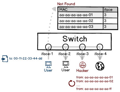 如果能讓交換機的學習功能失效,那就退化成一個集線器了。由于交換機的硬件配置有限,顯然不可能無限多的記錄地址對應條目。我們不停偽造不重復的源地址,交換機里的記錄表很快就會填滿,甚至覆蓋原有的學習記錄,用戶的數(shù)據(jù)包無法正常轉(zhuǎn)發(fā),只能廣播到所有接口上了。