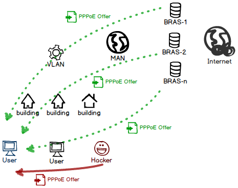 類似 DHCP 協(xié)議,PPPoE 也是通過廣播來探尋有哪些可用的終端,意味著整個小區(qū)的內(nèi)網(wǎng)用戶都能收到;同時探尋包一直往上冒泡,直到被城域網(wǎng)的終端們收到,然后開始紛紛回應。