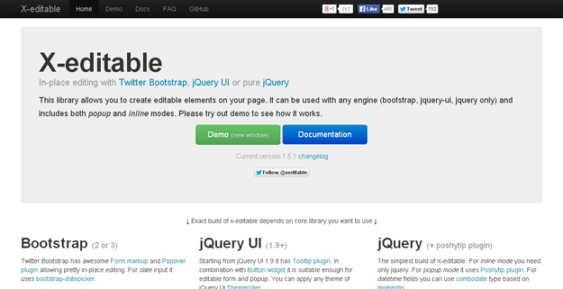 X-editable 支持Twitter Bootstrap,jQuery UI的或純jQuery的就地編輯。 這個(gè)庫允許你在你網(wǎng)頁上創(chuàng)建可編輯元素。 它同時(shí)包括彈出和內(nèi)嵌模式。 它是bootstrap可編輯插件的新方式,大力地重構(gòu)和完善過。 它支持像文字,區(qū)域文本,選擇,日期,日期ui和清單的輸入類型。 它支持客戶端和服務(wù)器端驗(yàn)證。容器位置是完全可定制的。 用戶可以通過單擊,雙擊或手動(dòng)切換。它工作于IE7+和所有的現(xiàn)代瀏覽器。