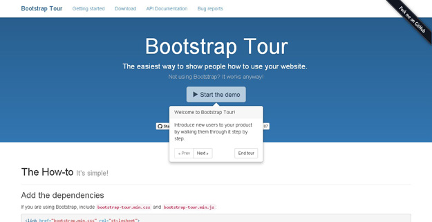 Twitter Bootstrap Popovers通過快速簡便的方法來建立你們的產(chǎn)品教程。 此庫不依賴于完整的Bootstrap 程序包。 唯一的依賴是tooltip 和popover 文件。Bootstrap Tour 保存了當(dāng)前步驟,如果用戶已經(jīng)讀完,不會(huì)再次顯示教程。