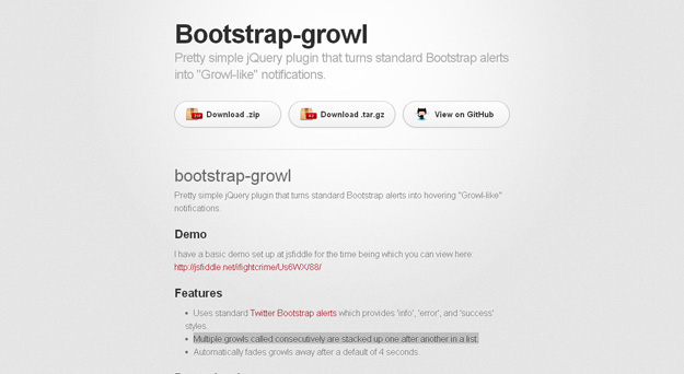 非常簡單的jQuery插件,可以讓標(biāo)準(zhǔn)的Bootstrap 提示變成進(jìn)入懸停時(shí)“咆哮般”提示。 它具有許多的功能,比如它使用標(biāo)準(zhǔn)的Twitter Bootstrap 提示,包括'info','error',和'success'的風(fēng)格,還支持連續(xù)多個(gè)咆哮般調(diào)用,層疊在一個(gè)列表。
