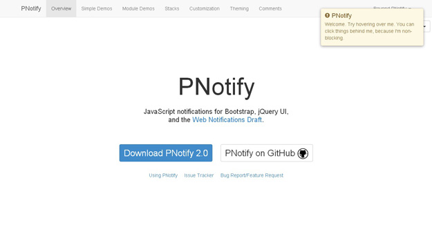 PNotify 是一個(gè)由SciActive 開發(fā)的 JavaScript的通知插件,曾用名Pines Notify。它的設(shè)計(jì)理念是提供一個(gè)極度靈活而又非常容易實(shí)現(xiàn)和使用。它可以提供非阻塞的通知。允許用戶在不關(guān)閉它的情況下點(diǎn)擊通知后面的元素。PNotify 使用了Bootstrap 和 jQuery UI來定義樣式,這意味著可以非常容易的對(duì)它進(jìn)行自定義主題樣式。