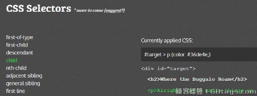 這是一個簡單可視化CSS選擇器。選擇左邊菜單中的選擇器,選擇的條目就會出現(xiàn)在右邊。