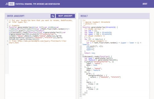 JS Nice 是一款讓經(jīng)過混淆處理的 JavaScript 代碼可讀更好的工具。它使用一種新型的用于 JavaScript 代碼美化的去混淆和去壓縮引擎。JSNice 采用先進的機器學習和程序分析技術,從可用的開源項目學習命名和類型規(guī)律。