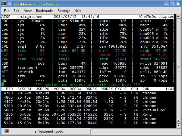 Atop是一個監(jiān)控系統(tǒng)資源和進程的工具。它通過CPU使用率來對列表中的進程進行降序排列,而每一個進程則包含了CPU、內存、磁盤和網絡狀態(tài)等信息。它的功能與top和htop類似。