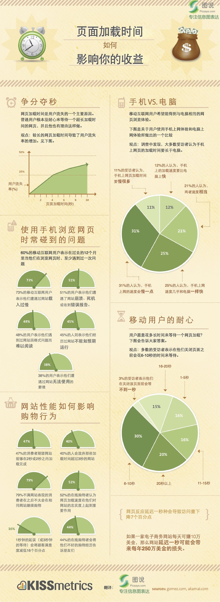 大家都知道網(wǎng)頁打開時(shí)間上有一個(gè)8秒原則,就是在等待網(wǎng)頁加載8秒之后,用戶將失去耐心,從而停止瀏覽該頁面。8秒并不是準(zhǔn)確的8秒鐘,只是向網(wǎng)站方表明了加載時(shí)間的重要性。那么來到移動(dòng)互聯(lián)網(wǎng)時(shí)代,網(wǎng)站的加載時(shí)間又是如何影響用戶行為的呢?對于一個(gè)日收益10萬的網(wǎng)站來說,網(wǎng)頁每延遲一秒鐘就有可能帶來每年250萬美元的損失!