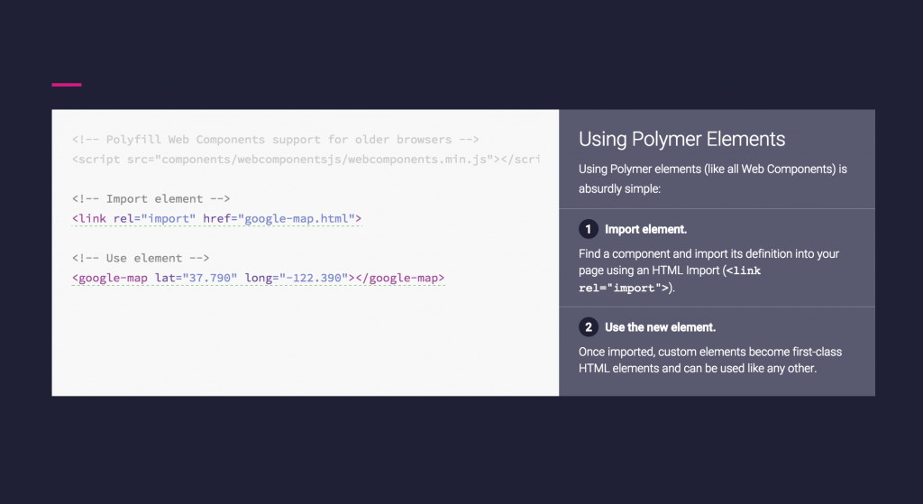 而這就是Web Components所能做的事情,但是現(xiàn)在很多設(shè)計(jì)師都沒(méi)有用它把自己給武裝起來(lái)。而現(xiàn)在谷歌Material design就是一個(gè)很好的開(kāi)始,它提供了豐富的動(dòng)畫和交互方面的組件,用戶只需要如下圖般簡(jiǎn)單幾行代碼就能進(jìn)行使用: