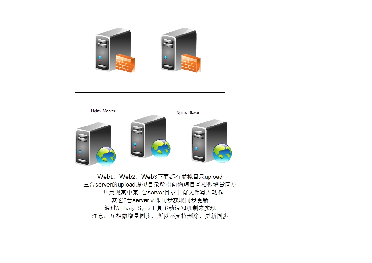 上述架構(gòu)中只能在這幾臺(tái)Web服務(wù)器上互相“增量同步”,這樣一來,就不支持文件的“刪除、更新”操作的同步了。
