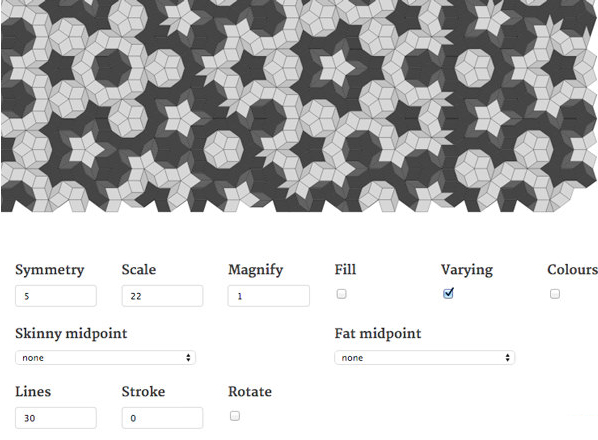 使用 quasi,你可以生成如下看到的 Quasicrystal 圖片。這個(gè)生成器只是試驗(yàn)性的,但是結(jié)果卻是很酷。你可以通過(guò)改變選項(xiàng)值試用一下,然后使用'Save SVG'按鈕下載下來(lái)。