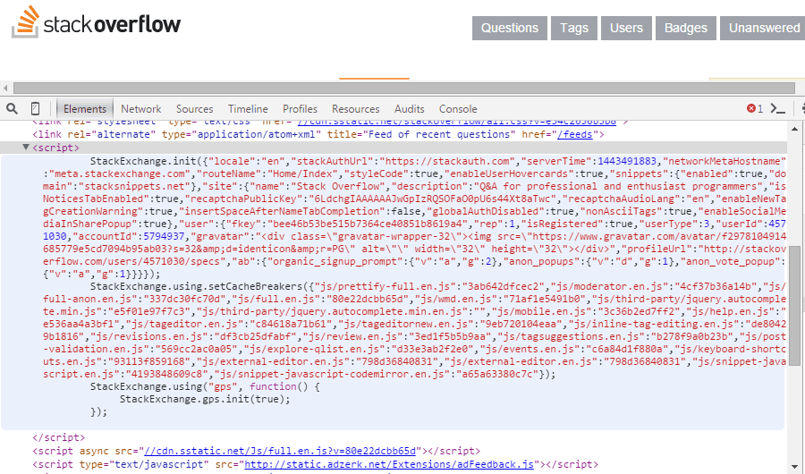 正如你看到的,StackOverflow 注入了一些個人的設(shè)置,如 isNoticesTabEnabled。這個簡單的JSON代碼片段為你使用靜態(tài)JavaScript文件自定義行為提供了必要的數(shù)據(jù)支持。為了實現(xiàn)這一點,需要序列號服務(wù)器端類為JSON,然后放置在<head>中。然后你可以在靜態(tài)的JavaScript文件中根據(jù)需要參考這個數(shù)據(jù)結(jié)構(gòu),能夠使用它,是因為它被注入到<head>中。