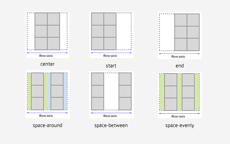 愚人碼頭注:網(wǎng)上找了一張圖片能更好的解釋justify-content屬性值的表現(xiàn),如圖: