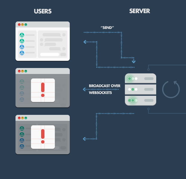 在客戶端這邊,我們有一個 HTML 頁面,上面有個兩個 js 方法,一個是用于觸發(fā)事件的 “發(fā)送” 按鈕,這會把把輸入的消息通過 webscoket 發(fā)送,另一個方法是用 webscoket 在客戶端上監(jiān)聽服務端來的推送(例如,其他用戶發(fā)送的消息)。