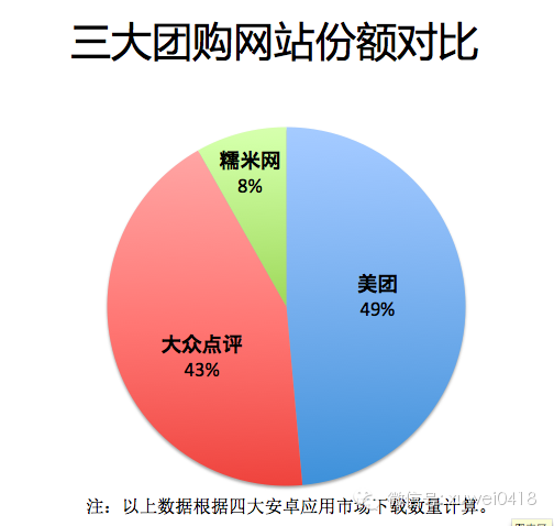 接下來(lái)我還統(tǒng)計(jì)了4家主流應(yīng)用商店當(dāng)中,代表身后的BAT出戰(zhàn)的三大團(tuán)購(gòu)網(wǎng)站的下載數(shù)量,單就這三家對(duì)比來(lái)看:美團(tuán)相當(dāng)于是大眾點(diǎn)評(píng)和糯米團(tuán)的總和,占了49%,大眾點(diǎn)評(píng)實(shí)力也不俗,占到43%,剩下可憐的8%留給了百度的糯米團(tuán)。