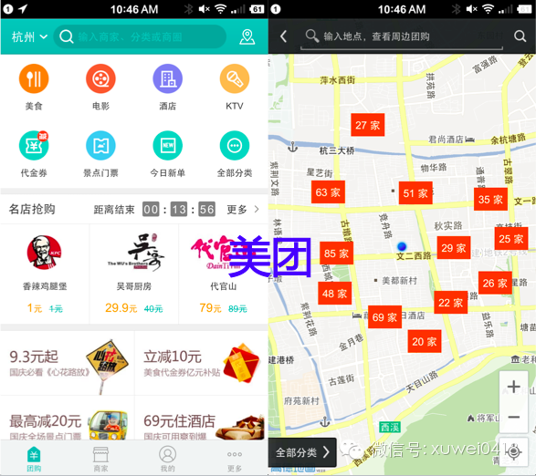 也許有些愛思考的讀者會(huì)說(shuō):“不一定啊,我用團(tuán)購(gòu)軟件去找店的。”那么請(qǐng)大家對(duì)照一下下面兩張圖:第一張左邊是百度地圖首頁(yè),右邊是點(diǎn)擊“附近”進(jìn)入的商戶類目頁(yè)面;第二張左邊是美團(tuán)網(wǎng)的首頁(yè),右邊是點(diǎn)擊“地圖”進(jìn)入的地圖頁(yè)面。怎么樣,是不是感覺(jué)二者只是換了一下順序而已?
