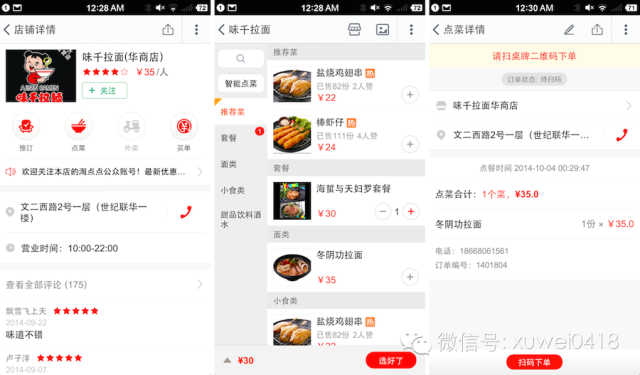 第二個(gè)例子是淘寶的淘點(diǎn)點(diǎn),合作的商家可以把菜譜上傳上來(lái),消費(fèi)者可以在手機(jī)上直接把菜點(diǎn)好,然后到店以后,掃描所在桌位的二維碼就可以下單了,消費(fèi)結(jié)束之后,也可以直接用手機(jī)掃碼支付。如果是外賣的話就更省事,在手機(jī)上點(diǎn)好,付款,然后等著送貨就ok。