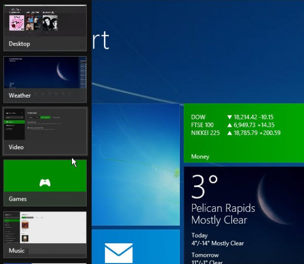邊角導(dǎo)航欄在配備觸摸屏的設(shè)備上顯得更加合理,在傳統(tǒng)的桌面電腦中并非十分得心應(yīng)手。當(dāng)用戶把鼠標(biāo)指針放在屏幕的角落上時(shí),導(dǎo)航欄會自動(dòng)彈出并顯示近期應(yīng)用。此功能在Windows 10中被取消,虛擬桌面成為了取代它的新功能。