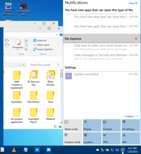 Action Center成為了微軟新寵兒,它為用戶提供了從應(yīng)用程序,近期電子郵件和系統(tǒng)的通知,同時(shí)也讓用戶快速進(jìn)行系統(tǒng)設(shè)定,如Wi-Fi、顯示設(shè)置和平板模式 切換。如果你使用的是觸控設(shè)備,那么從右邊滑動(dòng)手指就能呼出菜單。如果沒有,也能單擊位于任務(wù)欄的圖標(biāo)呼出。